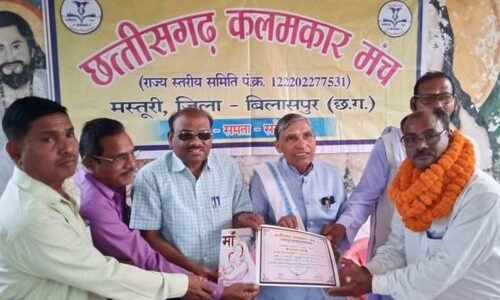 (मनोज जायसवाल) — 48 साहित्यकारों को “साहित्य शब्दांजलि सम्मान 2025” का सम्मानपत्र एवं मेडल प्रदान किया गया। इसे मिलाकर छत्तीसगढ़ कलमकार मंच द्वारा सम्मानित होने वाले कलमकारों की संख्या 1114 हो जाएगी। बिलासपुर(सशक्त हस्ताक्षर)। 13 जुलाई 2025 को कानन पेंडारी…