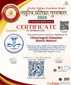 -वर्थी वैलनेस फाउंडेशन द्वारा छत्तीसगढ़ कलमकार मंच मस्तूरी को साहित्यिक, सांस्कृतिक एवं सामाजिक सेवाओं के क्षेत्र सम्मान।