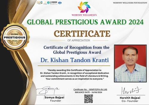 ”डॉ. किशन टंडन क्रांति को ग्लोबल प्रेस्टीजियस अवार्ड”