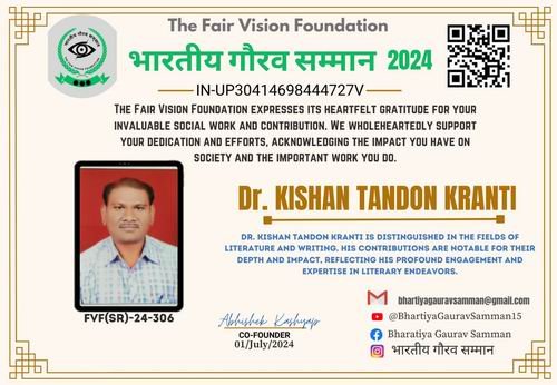 इस सम्मान के तहत उत्कृष्ट क्वालिटी का सम्मान पत्र, मेडल, ट्रॉफी इत्यादि दी जाती है। डॉ. किशन टंडन ‘क्रांति’ साहित्य के क्षेत्र में एक जाना पहचाना नाम है। वे हरफनमौला साहित्य लेखक हैं। अब तक गद्य और पद्य की लगभग सभी प्रमुख विधाओं में उनकी 54 पुस्तकें प्रकाशित हो चुकी हैं। इसमें 28 काव्य संग्रह, 2 ग़ज़ल संग्रह, 2 बाल कविता संग्रह, 2 हास्य व्यंग्य संग्रह, 10 कहानी संग्रह, 2 उपन्यास, 7 लघुकथा संग्रह तथा 1 यात्रा संस्मरण शामिल हैं। वे 14 साझा काव्य संकलनों के सम्पादक होने के अलावा छत्तीसगढ़ कलमकार मंच के संस्थापक एवं प्रदेशाध्यक्ष भी हैं।